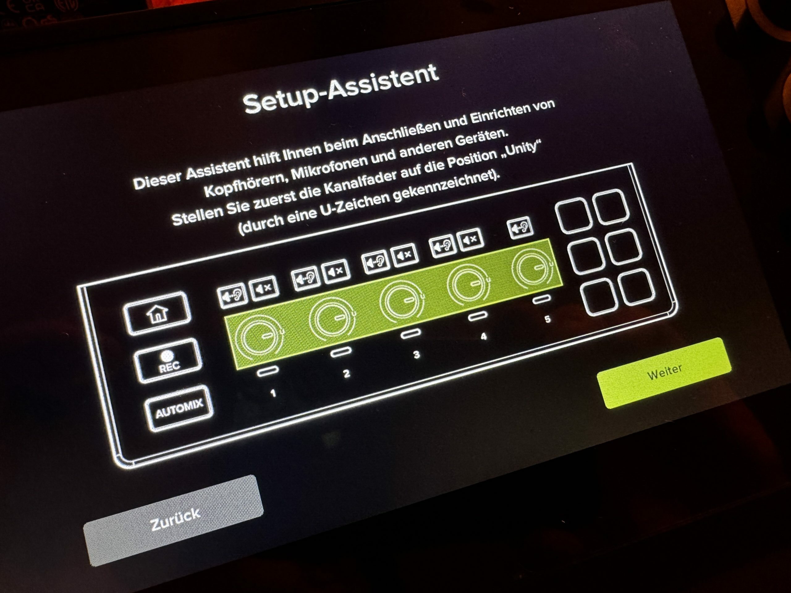Der Bildschirm ist in mehrere Tabs unterteilt, wobei der Übersichts-Tab der Hauptbildschirm ist. Hier hat jeder Kanal seine eigene Pegelanzeige und kann entweder über Touchscreen oder die Drehregler und Tasten gesteuert werden.