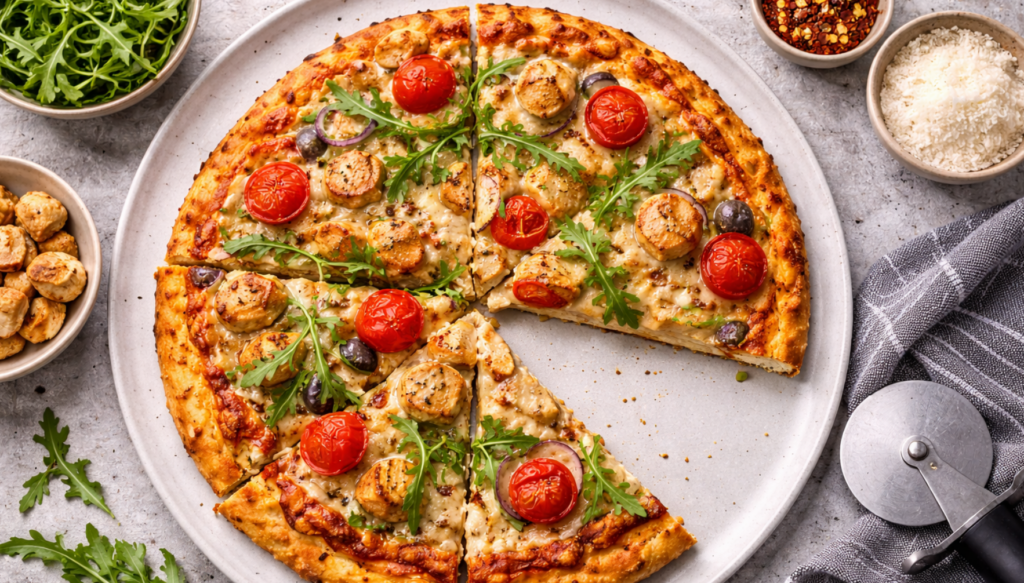 Teilst du die Pizza in zwei Portionen, liegt eine Mahlzeit bei rund 400–450 kcal mit 40–50 g Protein. Ja, „Pizza teilen“ geht und es ist gar nicht schwer, man muss sich keine ganze Pizza reinzimmern.